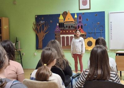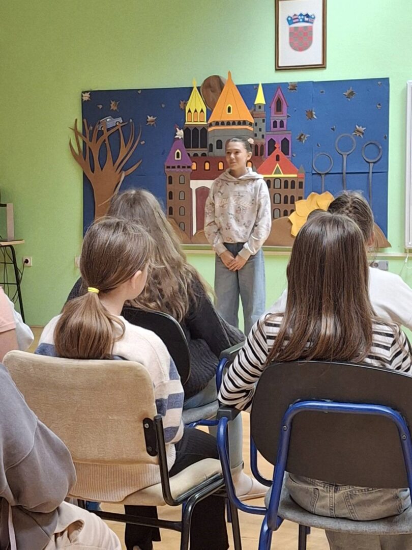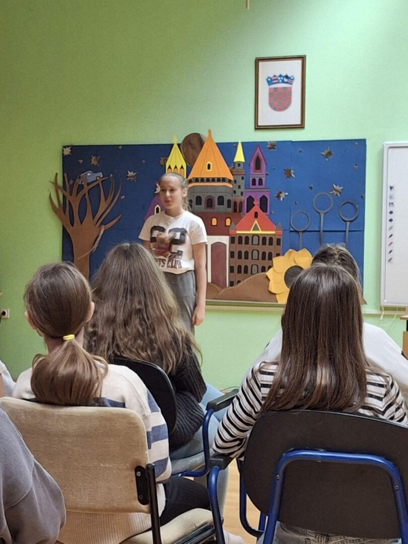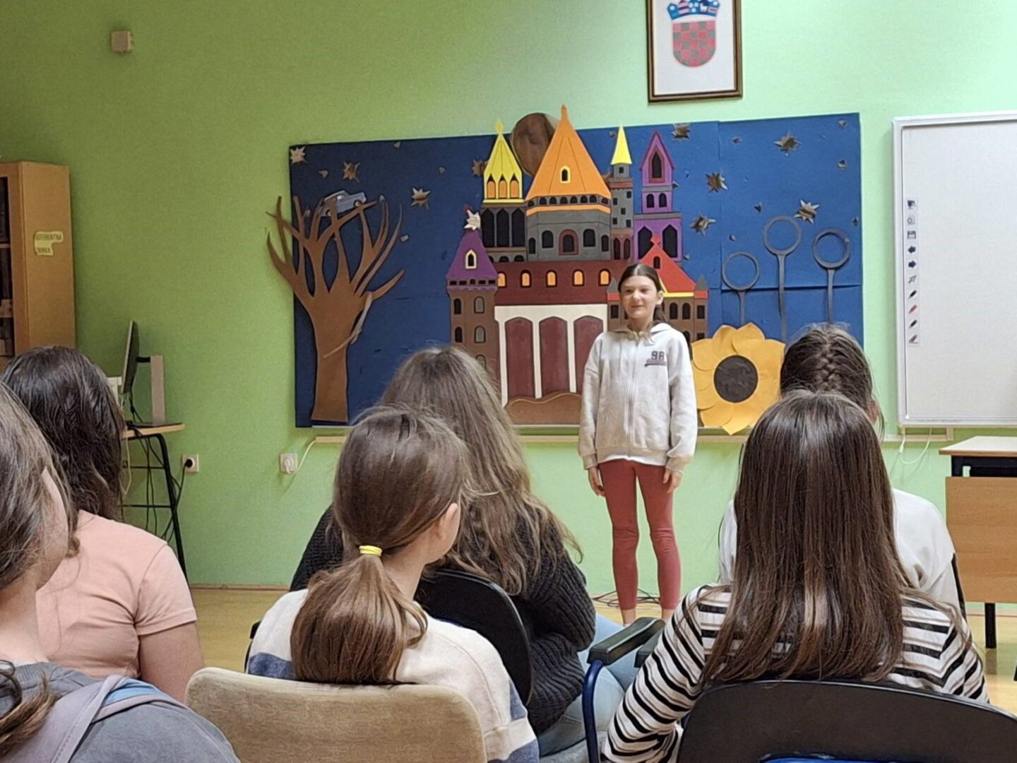 Ispred zainteresirane publike redali su se probrani stihovi Cesarićevih pjesama posvećenih upravo najšarenijem godišnjem dobu. Ana, Valentina, Marija, Lucia i Slađana bile su na visini zadatka i uspješno su krasnoslovile odabrane pjesme te su zaslužile svaki upućeni aplauz. Žao nam je što s nama nisu bile Danijela te Anamarija i Valentina, opravdano izostale zbog terenske nastave u Vukovaru.