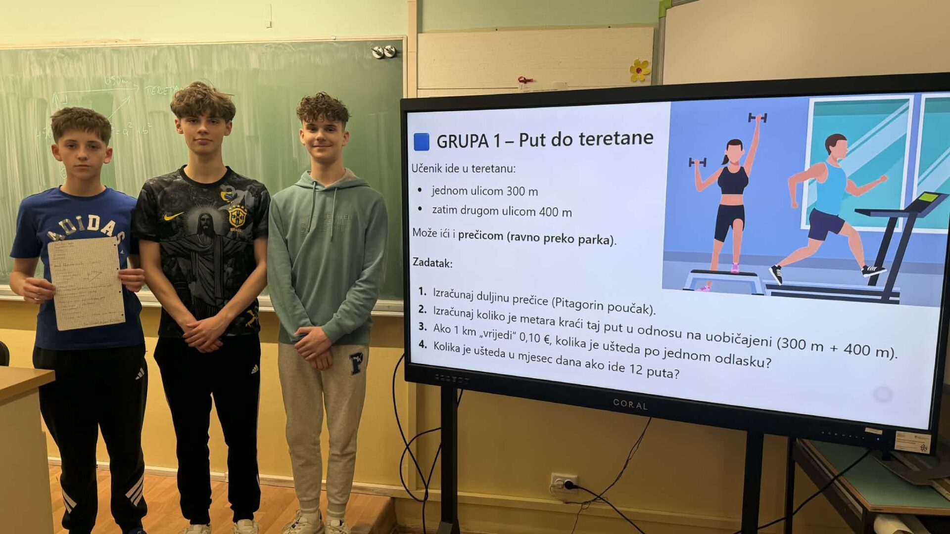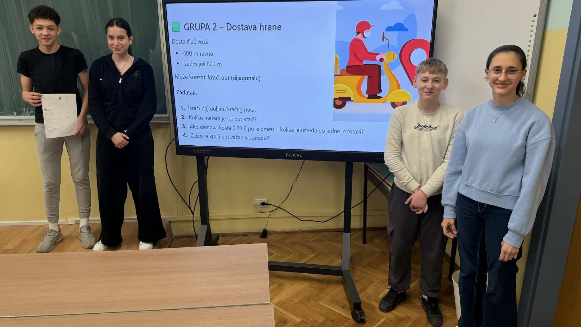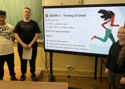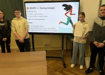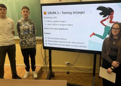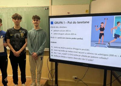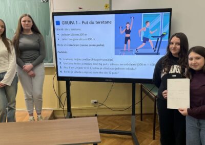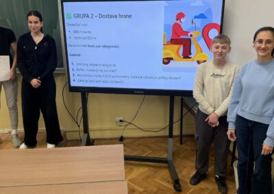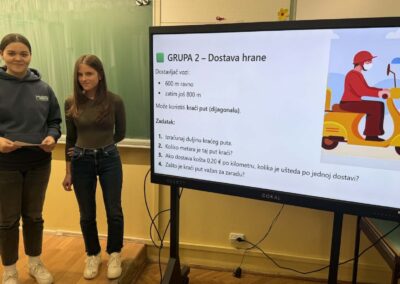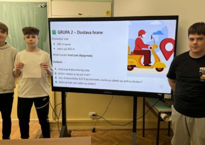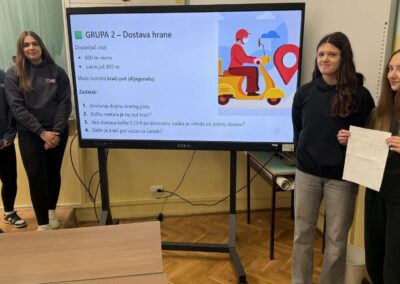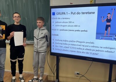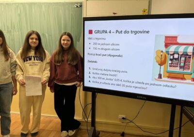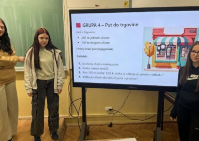U radu u skupinama učenici su primjenjivali Pitagorin poučak na problemskim zadatcima iz stvarnih životnih situacija, poput odabira kraćeg puta i procjene troškova kretanja. Na taj su način razvijali razumijevanje kako matematičko znanje doprinosi donošenju odgovornih i racionalnih financijskih odluka. Radionica je provedena u okviru redovne nastave Matematike, a završni dio uključivao je prezentacije učenika koji su predstavili svoja rješenja i zaključke. Aktivnost je bila usmjerena na razvoj financijske pismenosti, logičkog zaključivanja i povezivanja nastavnih sadržaja sa svakodnevnim životom.