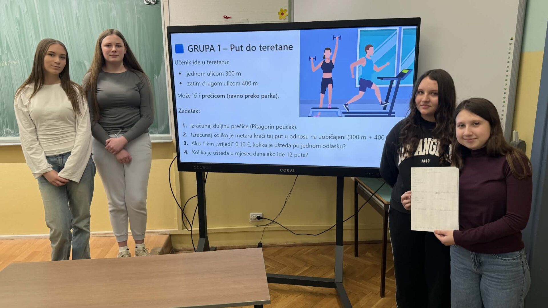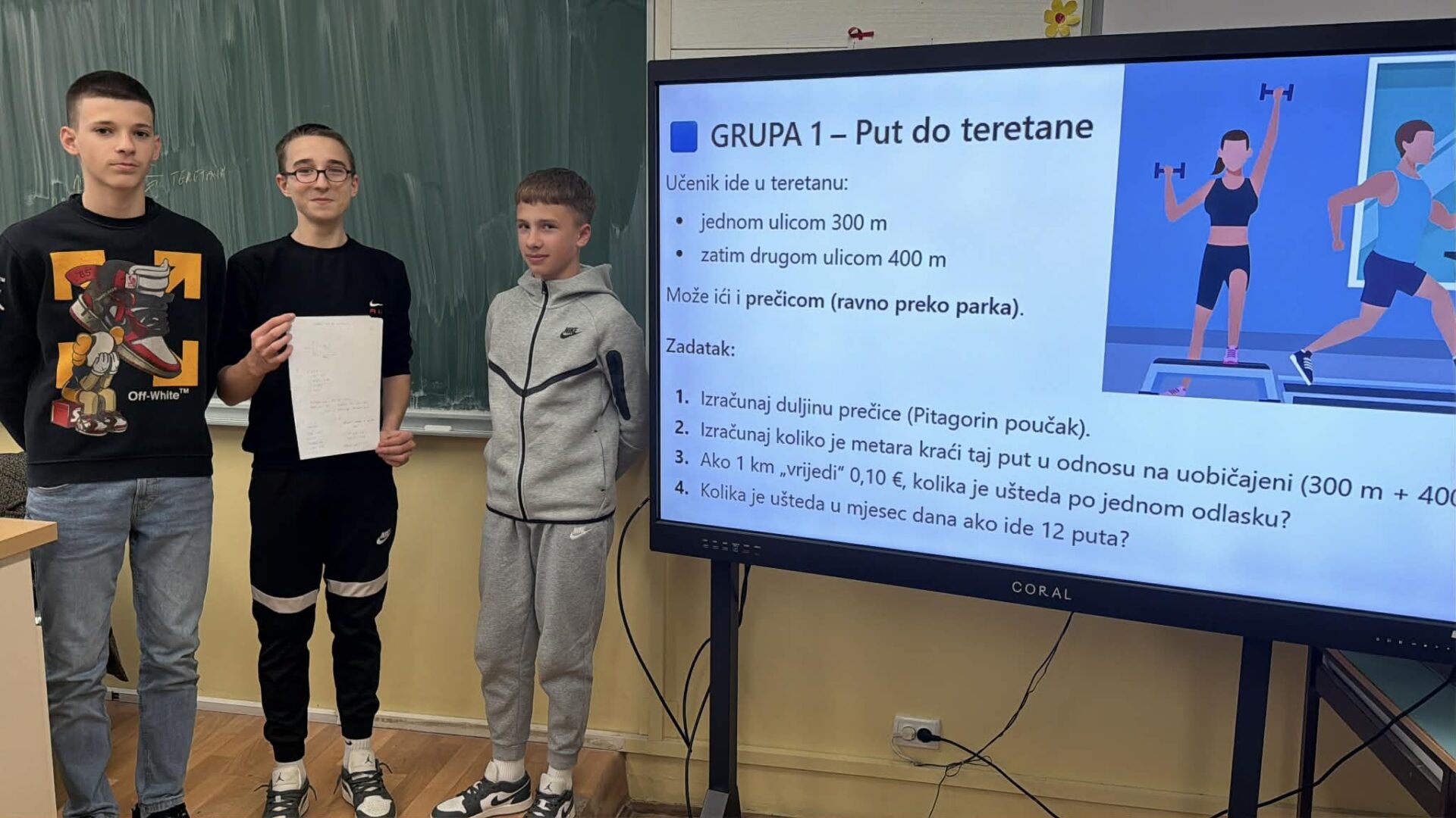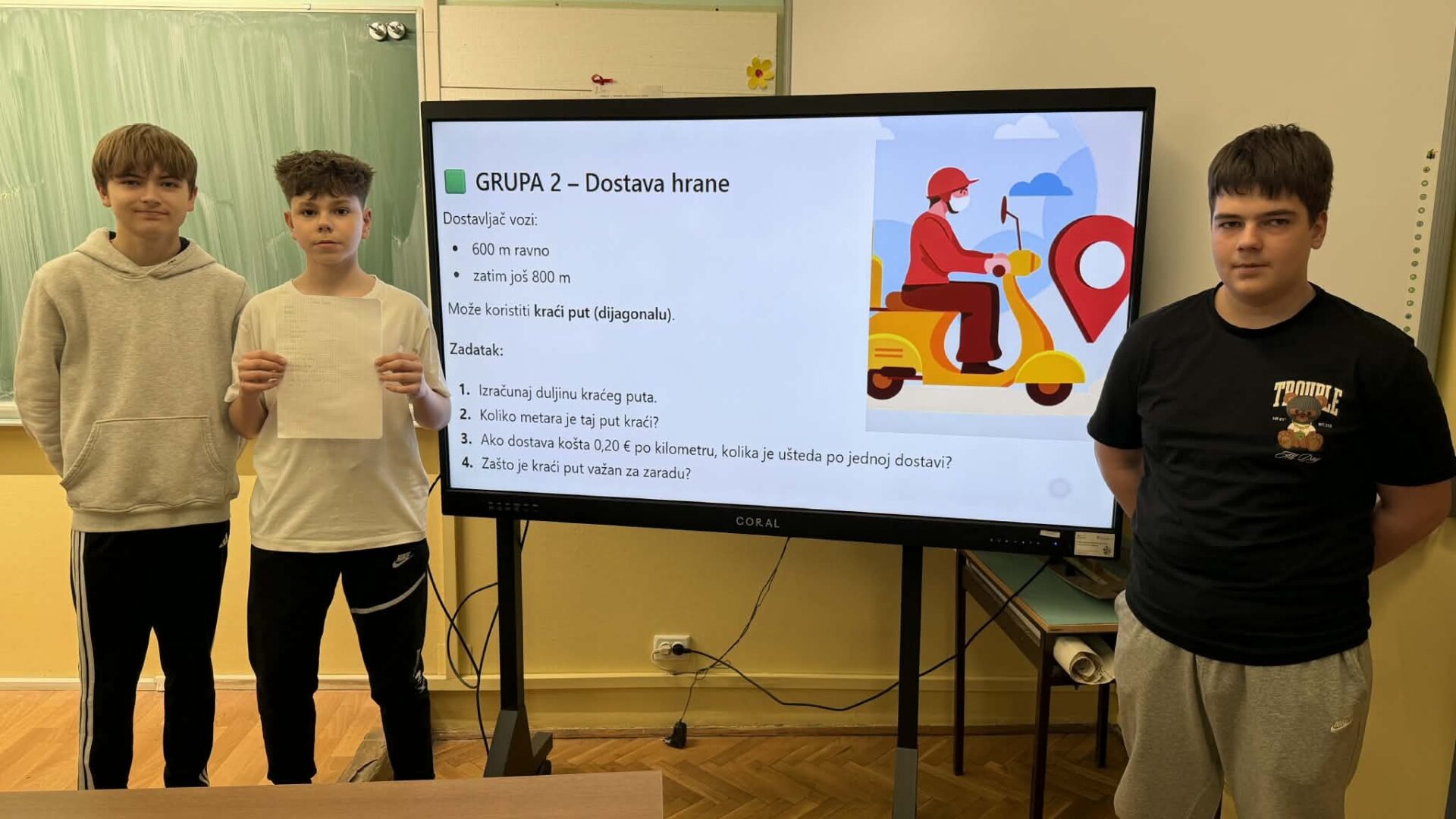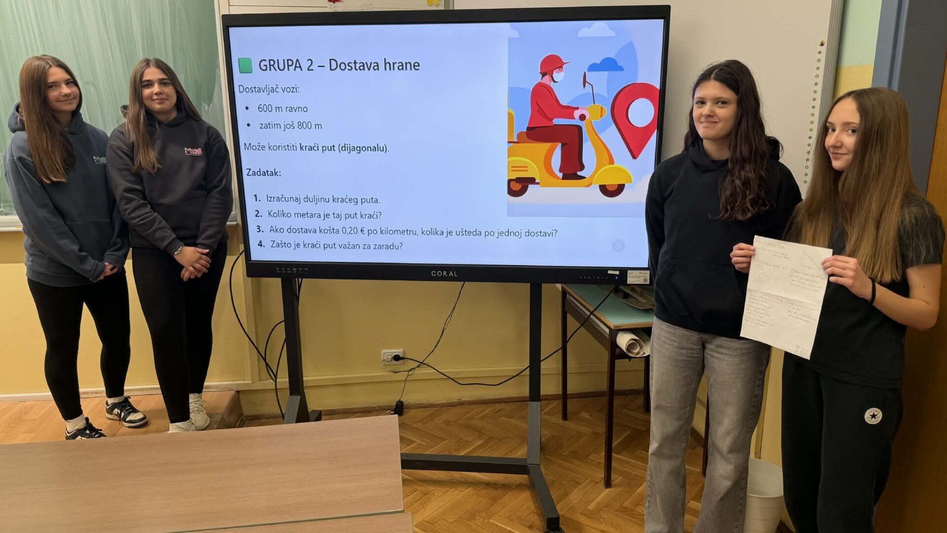 U radu u skupinama učenici su primjenjivali Pitagorin poučak na problemskim zadatcima iz stvarnih životnih situacija, poput odabira kraćeg puta i procjene troškova kretanja. Na taj su način razvijali razumijevanje kako matematičko znanje doprinosi donošenju odgovornih i racionalnih financijskih odluka. Radionica je provedena u okviru redovne nastave Matematike, a završni dio uključivao je prezentacije učenika koji su predstavili svoja rješenja i zaključke. Aktivnost je bila usmjerena na razvoj financijske pismenosti, logičkog zaključivanja i povezivanja nastavnih sadržaja sa svakodnevnim životom.