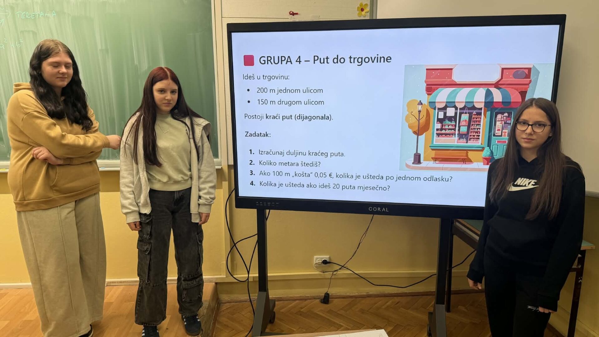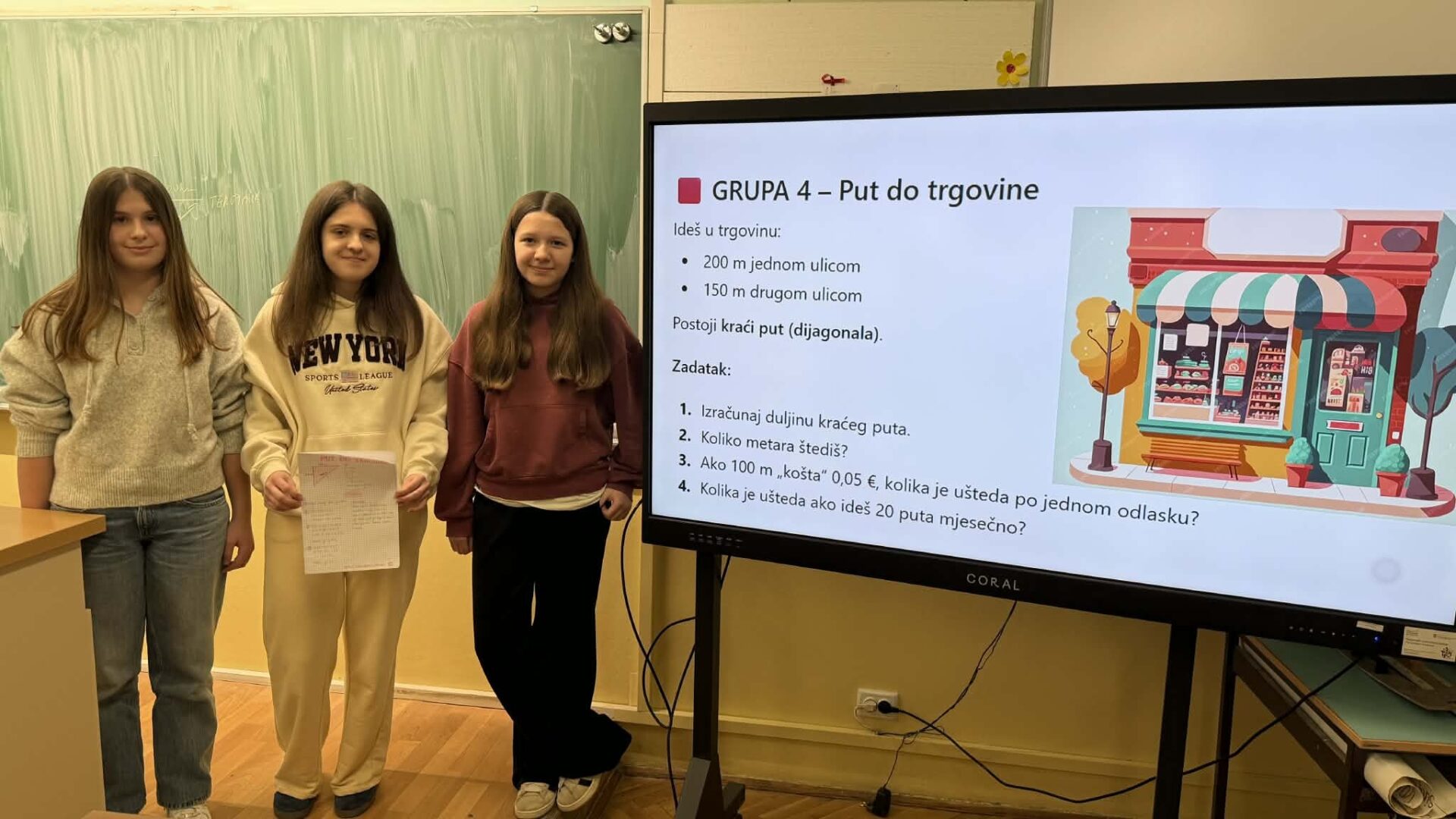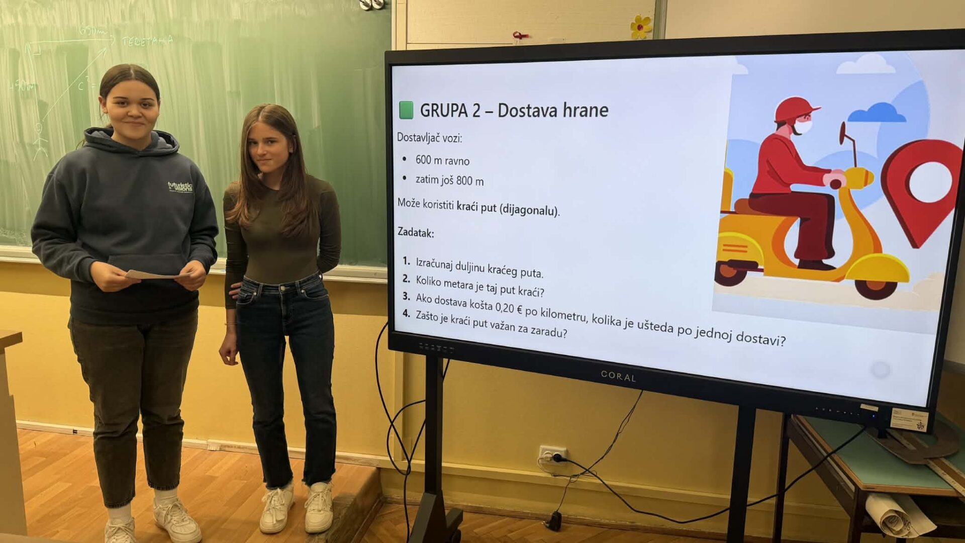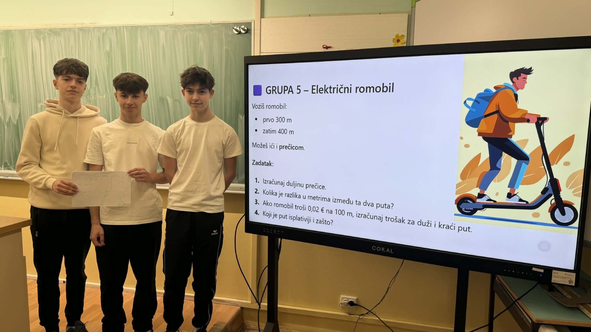 U radu u skupinama učenici su primjenjivali Pitagorin poučak na problemskim zadatcima iz stvarnih životnih situacija, poput odabira kraćeg puta i procjene troškova kretanja. Na taj su način razvijali razumijevanje kako matematičko znanje doprinosi donošenju odgovornih i racionalnih financijskih odluka. Radionica je provedena u okviru redovne nastave Matematike, a završni dio uključivao je prezentacije učenika koji su predstavili svoja rješenja i zaključke. Aktivnost je bila usmjerena na razvoj financijske pismenosti, logičkog zaključivanja i povezivanja nastavnih sadržaja sa svakodnevnim životom.