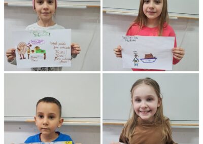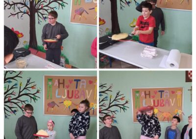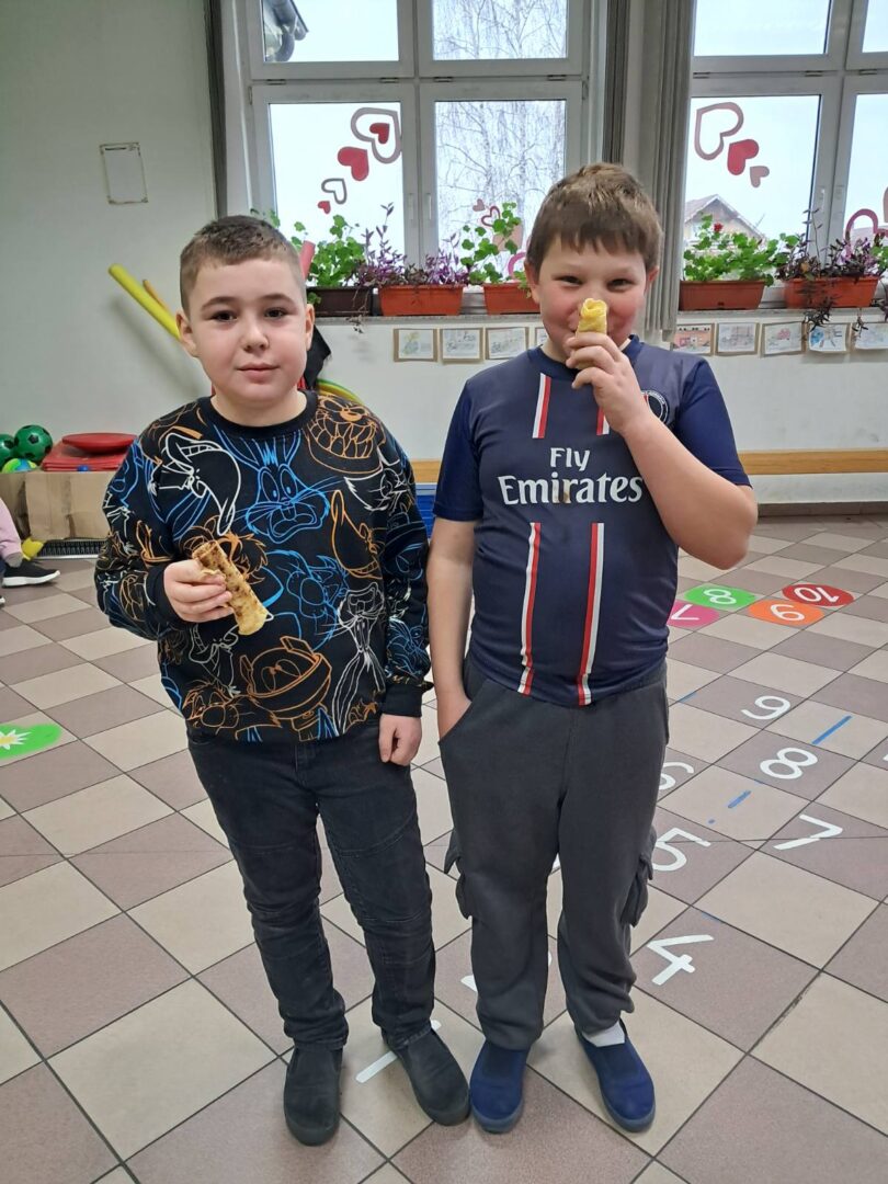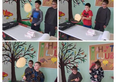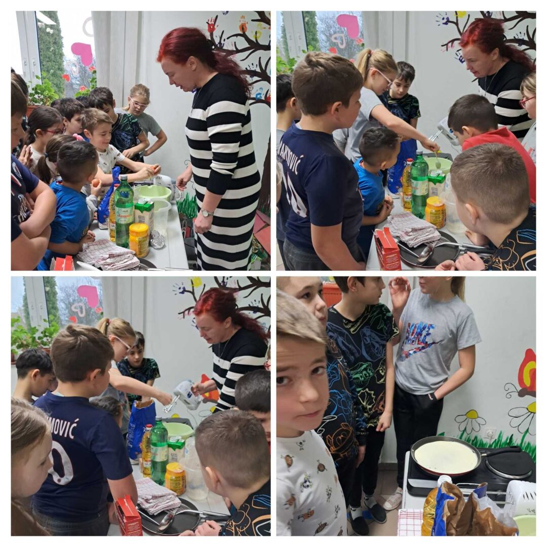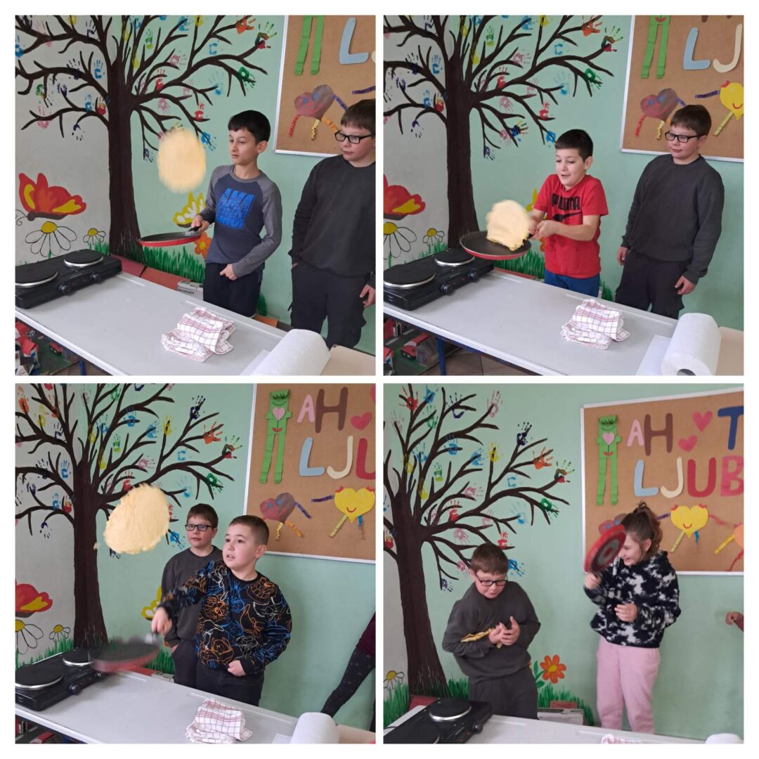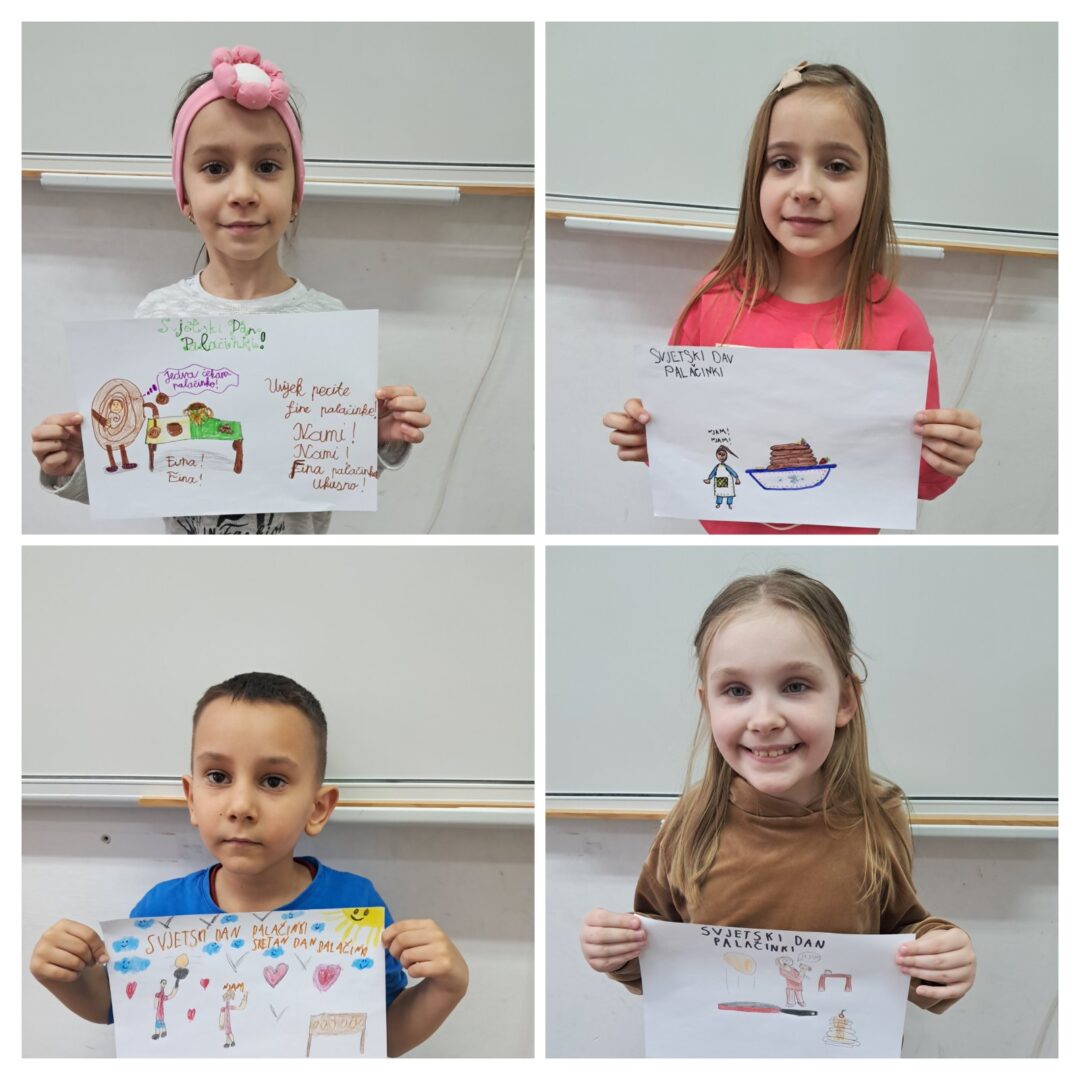 Učenici PŠ Kozice obilježili su Svjetski dan palačinki u petak, 20. 2. 2026. Prvo su poslušali pjesmicu o palačinkama, naučili kako i zašto se obilježava Svjetski dan palačinki, pogledali crtani film o palačinkama, umutili svoje palačinke, bacali ih u zrak, zasladili se palačinkama te izradili plakat o Svjetskom danu palačinka. Posebno iznenađenje bila je torta od palačinki koju je ispela Koranina i Gabrijelina mama. Hvala!