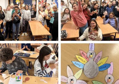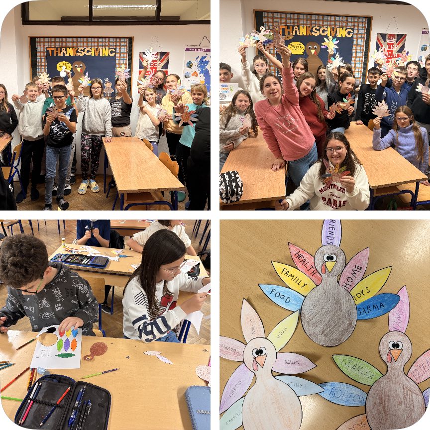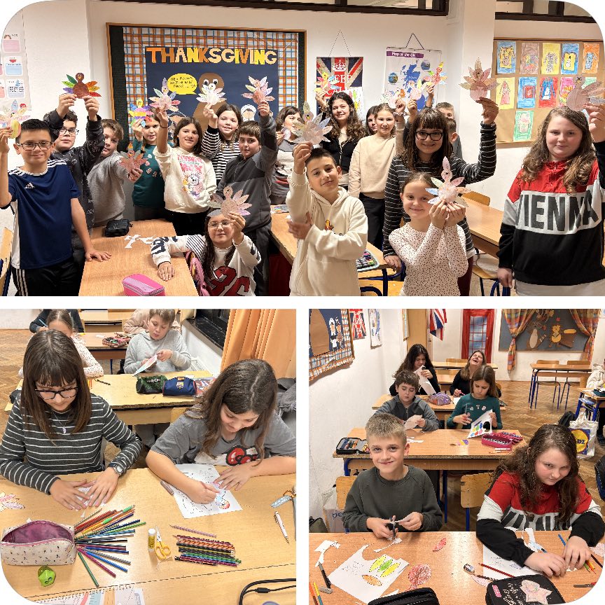 Učenici 5. razreda s učiteljicom Draženom Vujanović izrađivali su svoje verzije veoma popularne purice uz ispisivanje svega za što su zahvalni, dok su učenici 8.razreda čitali tekst o nastanku blagdana Thanksgiving, gdje se slavi i zašto te su nakon toga izrađivali slikovne umne mape o toj temi. Nakon svega uslijedila je rasprava i razgovor o samom blagdanu i svemu za što bismo trebali biti zahvalni.